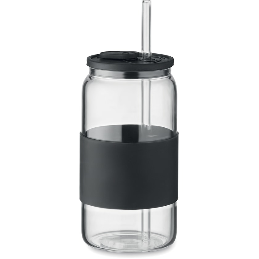 Glasbecher mit Deckel und Silikongriff. Der Glasbecher ist inklusive Strohhalm aus langlebigem Borosilikatglas gefertigt.