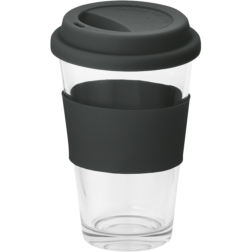 Glas mit Verschluss und Griff aus Silikon. Dank seines Griffes eignet sich Perris perfekt für warme Getränke. Die Bedruckung erfolgt auf dem Verschluss. Es ist nur ein einfarbiger Druck möglich.