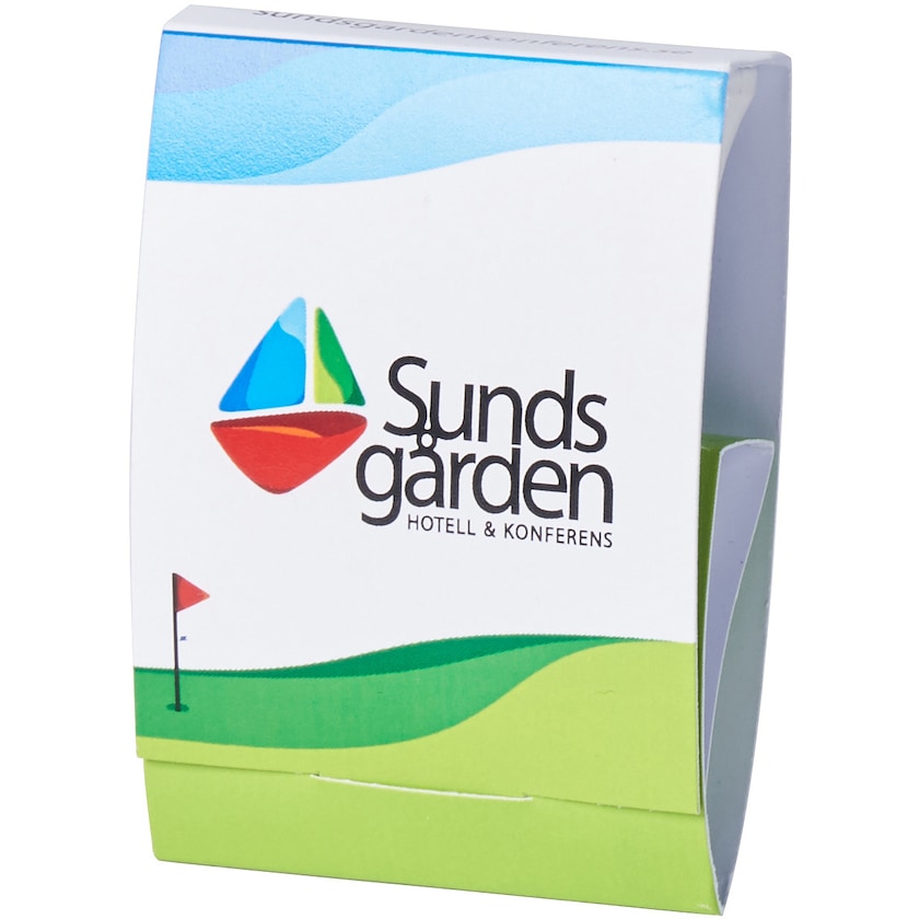 Kleine Papphülle mit vier Tees und einem Ballmarker. Wählen Sie eine Farbe für die Tees und eine Länge von 55, 70 oder 82 mm. Der Preis enthält 4-Farb-Fotodruck auf der Papphülle und dem Ballmarker und einfarbiger Druck auf den Tees. Der Ballmarker hat eine Druckfläche von Ø 25 mm und die Tees 25 x 4 mm (55 mm Tee), 34 x 4 mm (70 mm Tee) und 42 x 4 mm (82 mm Tee). Die Tees können auf auf dem Kopf bedruckt werden und haben dort eine Ø 9 mm Druckfläche.
