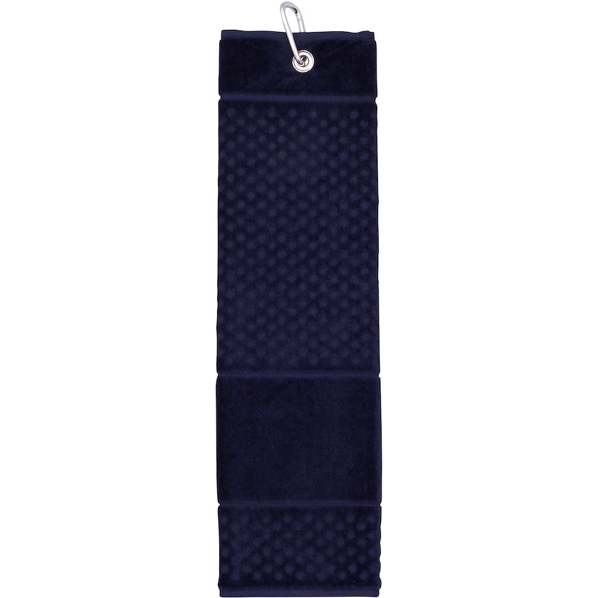 Luxeriöses Golfhandtuch aus kräftiger Baumwolle. Das Handtuch besteht aus einem dicken 650-Gramm-Stoff und ist dreifach gefaltet. An der oberen Kante befindet sich ein Karabinerhaken.
