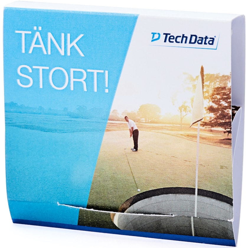 Papphülle mit vier Golftees, Ballmarker und Pitchgabel. Wählen Sie die Farbe für die Golftees selbst und auch eine länge von 55 oder 70 mm. Der Preis enthält einen 4-Farb-Fotodruck auf der Papphülle unf auf dem Ballmarker und einfarbigen Druck auf den Tees. Der Ballmarker hat eine Druckfläche von Ø 25 mm und die Golftees haben eine Druckfläche von 25 x 4 mm (55 mm Golftee) und 34 x 4 mm (70 mm Golftee). Die Tees können auf auf dem Kopf bedruckt werden und haben dort eine Ø 9 mm Druckfläche.