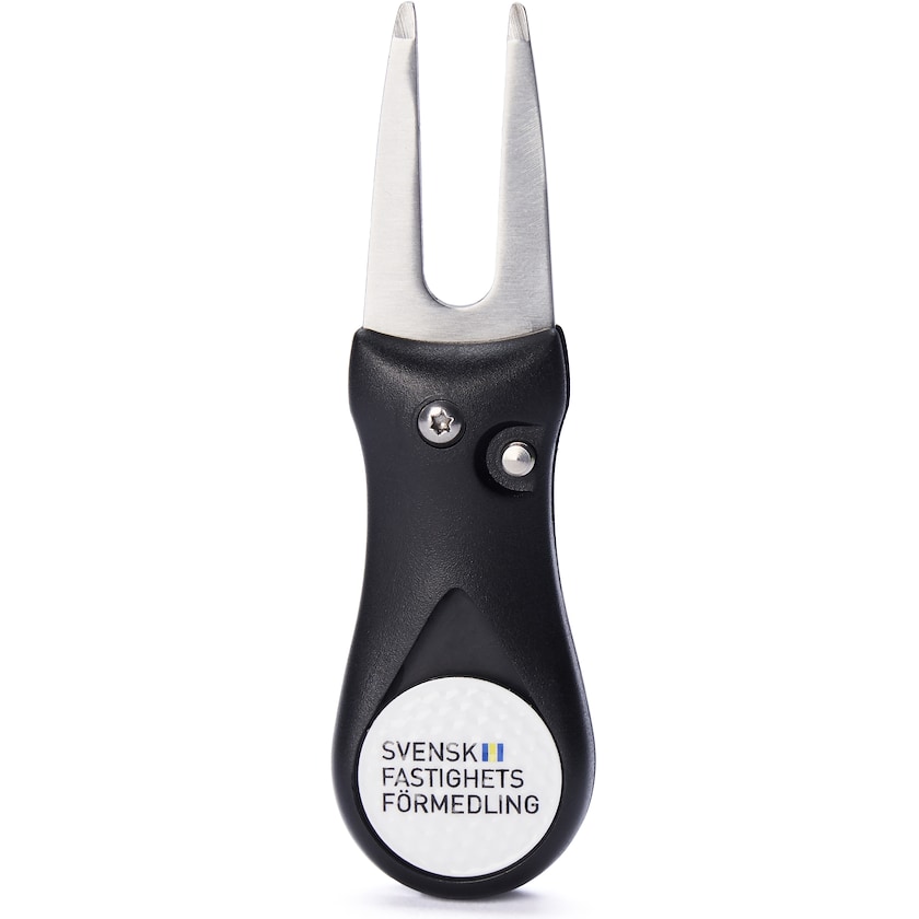 Pitchgabel zum Ausklappen mit Ballmarker. Der Druck erfolgt im 4-Farb-Fotodruck auf dem Ballmarker. Der Ballmarker erinnert an einen Golfball.
