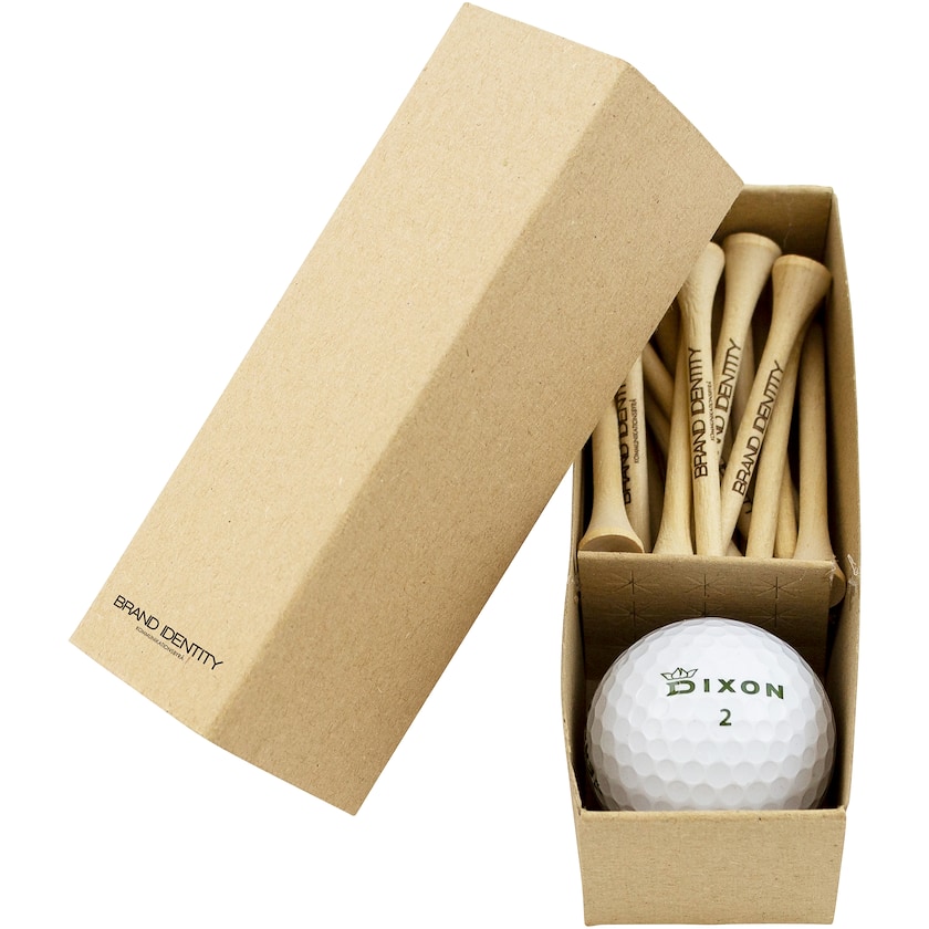 Set mit Golfball und Holztees. Der Golfball ist von der Marke Dixon Earth und von den Holztees sind 20 Stück verfügbar. Der Druckpreis bezieht sich auf den Druck auf den Golfball, die Holztees und die Pappschachtel. Nur 1-Farbdruck möglich.