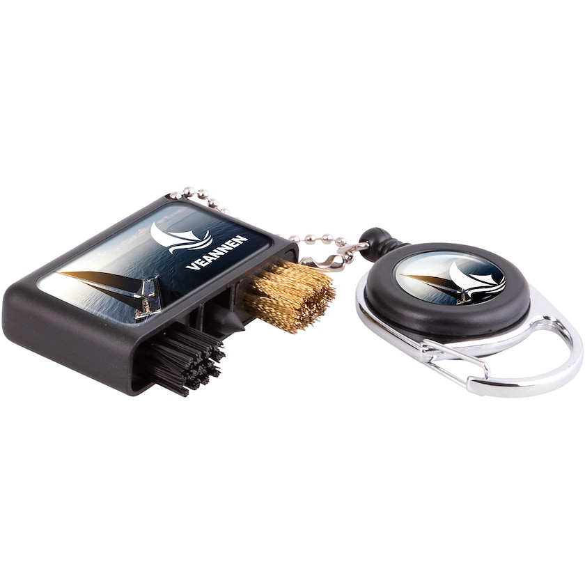 Schlägerreiniger, der an einem Liftkartenhalter befestigt ist. Der Schlägerreiniger hat eine Bürste aus Messing und eine aus Nylon. Zusätzlich gibt es einen praktischen Reinigungsstift. Der Druck erfolgt mit 4-farbigem Fotodruck sowohl auf dem Schlägerreiniger als auch auf dem Liftkartenhalter. Ihre Drucke werden durch eine Epoxidschicht geschützt, die dem Druck eine hochwertige Anmutung verleiht.