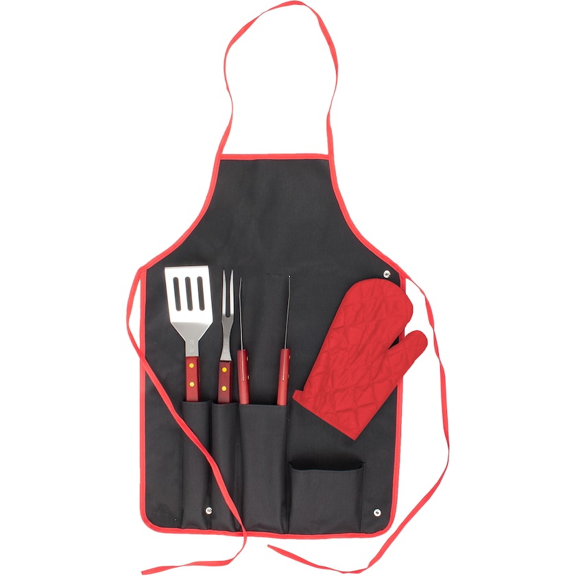 Schönes Grillset mit Verwahrungshülle und Schürze in einem. Die Grillsaison kann kommen! Das Set enthält Pfannenwender, Grillzange und Grillgabel mit Holzgriff, Schürze und Topflappen.
