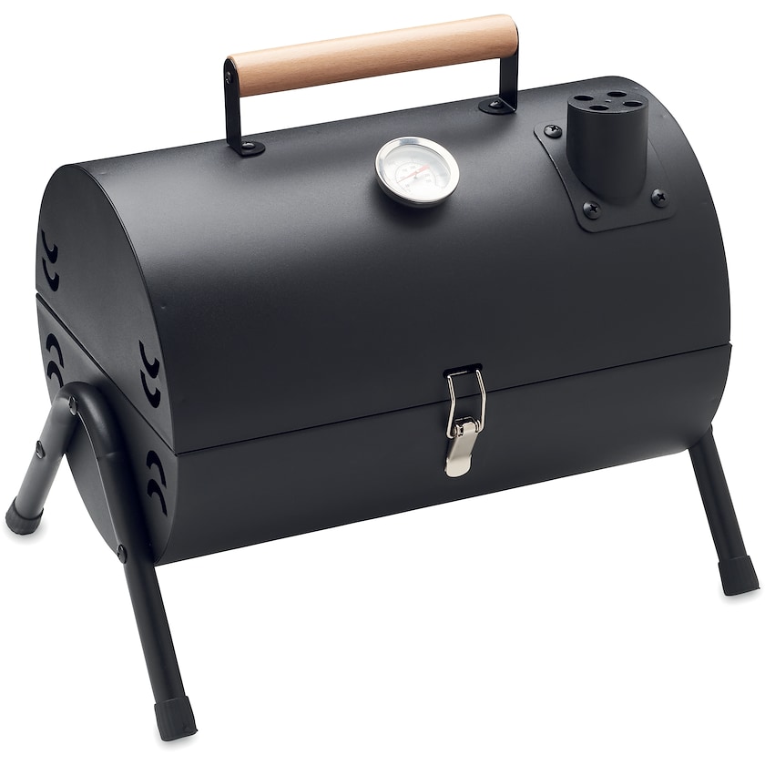 Tragbarer Grill aus robustem Eisen. Bradner ist mit einem Schornstein, einer Temperaturanzeige und einem Verschluss ausgestattet. Das Metall ist pulverbeschichtet. Der Griff ist aus Holz gefertigt.
