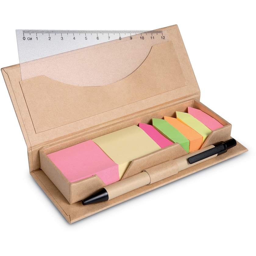 Haftstreifen Set mit Notizblock in 2 Farben und Haftstreifen und 5 Farben. Das Set enhält zudem ein transparentes 12 cm Lineal und einen Kugelschreiber aus Pappe.