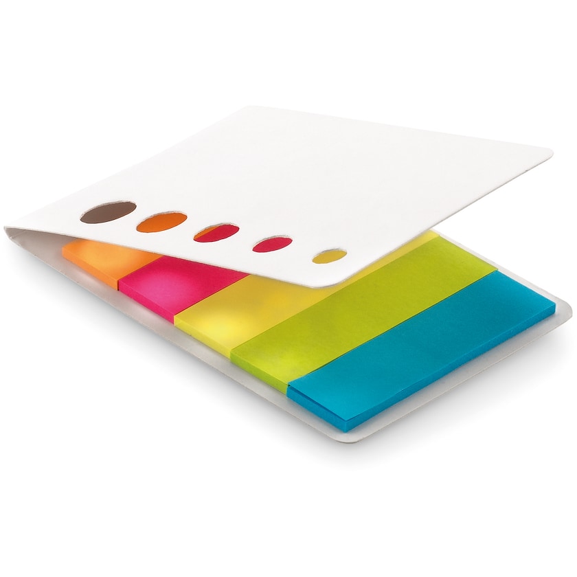 Set mit Markierungsstreifen in fünf verschiedenen Farben. Die Marker sind selbstklebend und eignen sich beispielsweise perfekt zum Lernen. Ein perfekter Werbeartikel für Studenten!