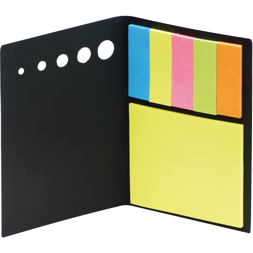 Set mit Notizblock und 5 Haftstreifen in verschiedenen Farben. Der bedruckbare Bereich befindet sich auf der Vorderseite des Einbands.
