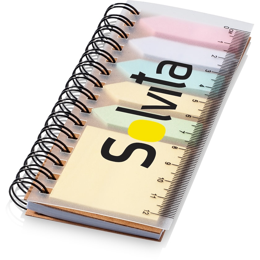 Haftstreifen mit Spiralbindung un Schreibblock. Spirale hat 25 Haftstreifen in 5 Farben, selbsthaftenden Notizblock mit 25 Blatt und 40 linierte Blätter. Der Plastikumschlag funktioniert als Lineal.
