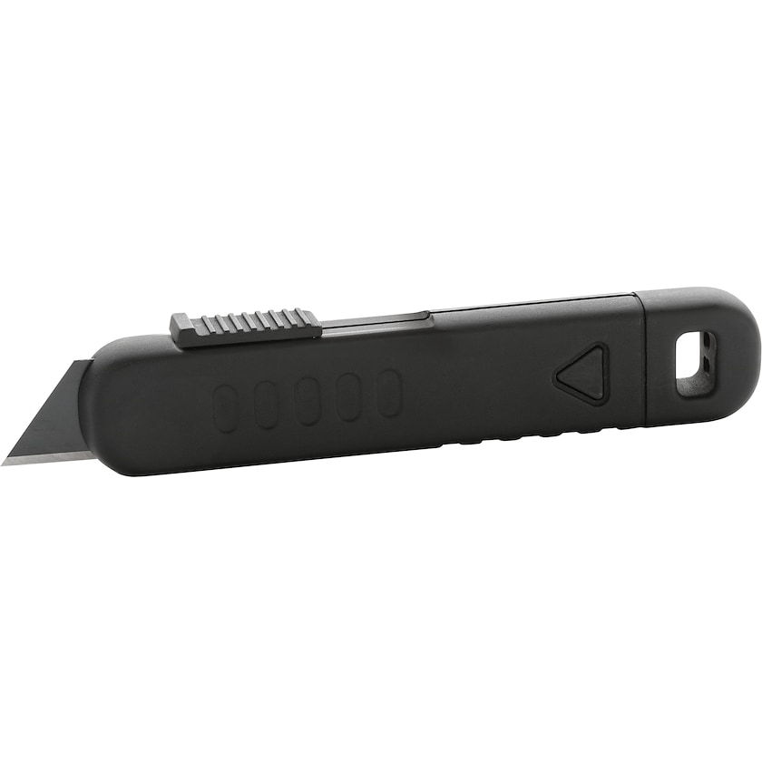 Schwarzes Teppichmesser von höchster Qualität. Die Klinge ist 18 mm, besteht aus Stahl und kann ausgetauscht werden. Ein formschönes Tepichmesser mit Logo.