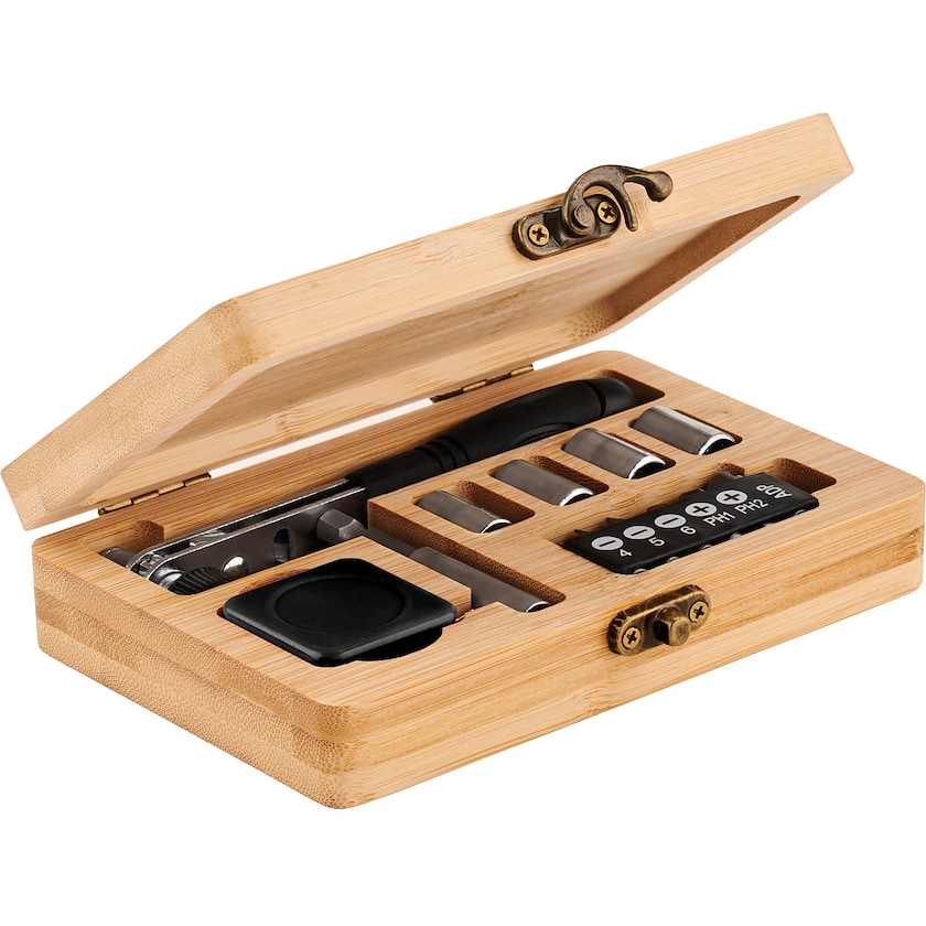 Hochwertige Werkzeugkiste aus Bambus. Ein perfektes Geschenk zum Beispiel für Hauskäufer. Die Kennzeichnung kann wahlweise mit 1-Farbdruck oder Lasergravur erfolgen.