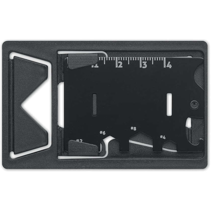 Mobile Stütze aus Edelstahl mit sechs Zusatzfunktionen. Die zusätzlichen Funktionen sind Lineal, Sechskantschlüssel, Flaschenöffner und Schraubendreher. Wird in einem Kunstlederetui geliefert.