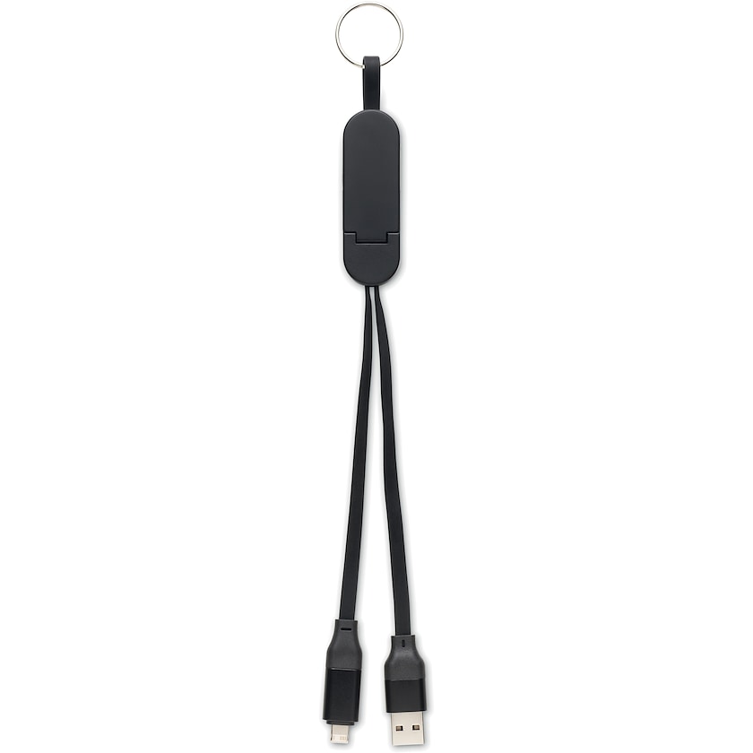 60-W-Ladekabel aus recyceltem ABS. Dient auch als Handyhalterung. Eingang: USB Typ A und USB Typ C. Ausgang: USB Typ C und Micro-USB (2-in-1-Stecker).