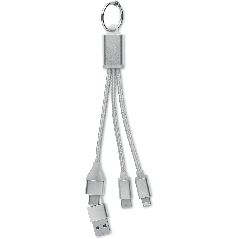 Ladekabel mit Schlüsselring und drei Anschlüssen. Bei den Anschlüssen handelt es sich um 2-in-1-Anschlüsse vom Typ C und A, Micro-B und Typ C. Wählen Sie zwischen Druck und Lasergravur.