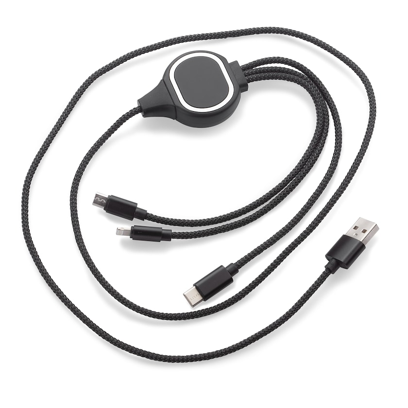 3-in-1-Kabel mit beleuchtetem Logo. Das Kabel hat einen Micro-USB-, einen USB-C- sowie einen Lightning-Stecker (iPhone). Die Kabel können nur zum Aufladen verwendet werden. Wenn eines der Kabel genutzt wird, leuchtet Ihr durch Lasergravur gedrucktes Logo.
