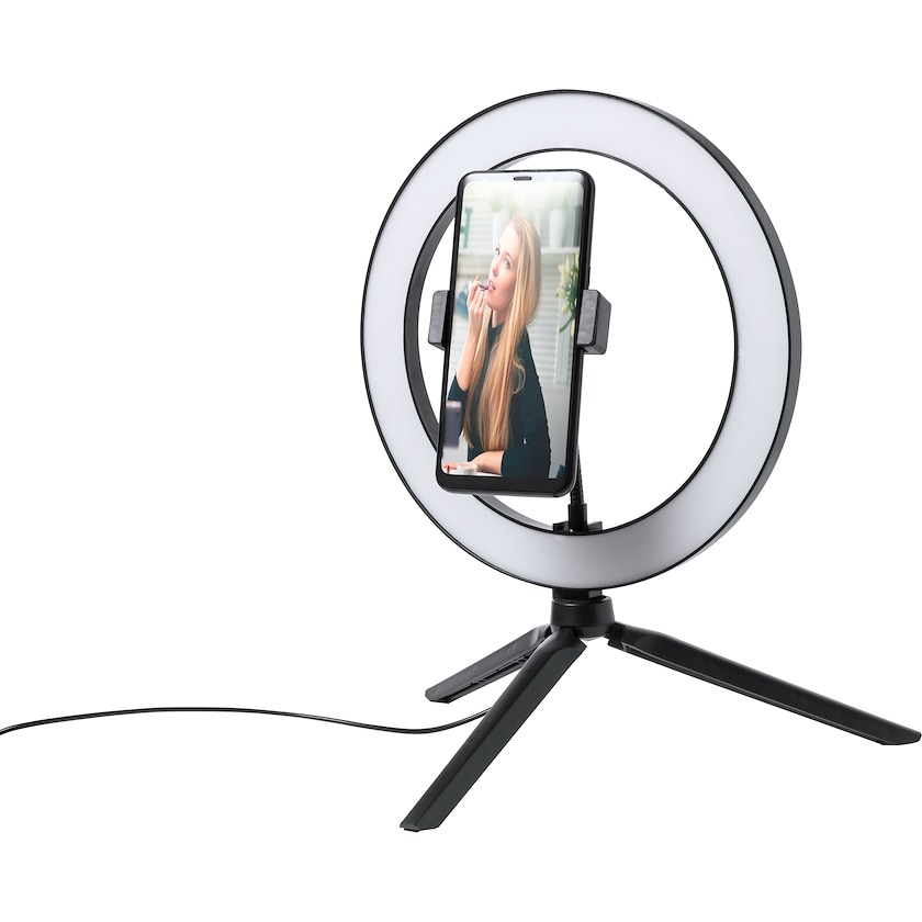 Ringbeleuchtung für Film-, Foto- und Videomeetings. Befestigen Sie Ihr Handy in der Halterung, stellen Sie das Licht ein und schon haben Sie das perfekte Licht für Ihr Selfie oder ein Videomeeting. Kommt mit USB-Ladekabel. Die Höhe der Lampe ist verstellbar.