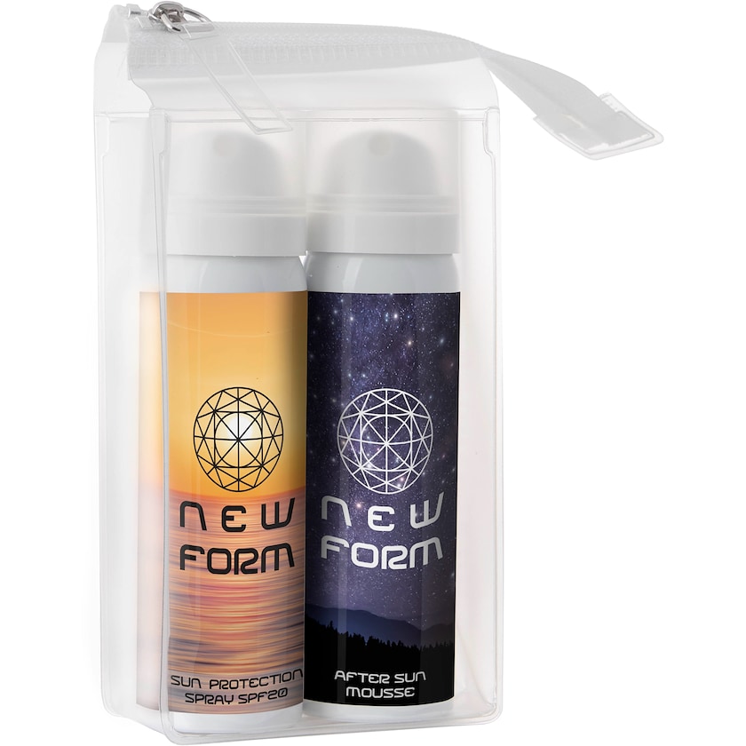 Set mit Sonnenspray und Sonnenlotion. Jede Aluminiumflasche enthält 50 ml. Das Sonnenspray hat Lichtschutzfaktor SPF30. Die Flaschen sind umweltfreundlich, da sie mit Luft statt mit Treibgas betrieben werden. Der Druckpreis bezieht sich auf den Druck auf beiden Flaschen.