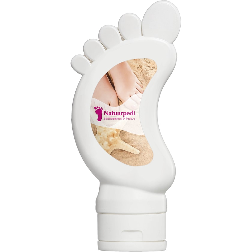 Pflegende Fußcreme in einer fußförmigen Tube. Die Fußcreme duftet nach Menthol und wirkt kühlend und feuchtigkeitsspendend. Die Creme ist dermatologisch getestet und gemäß der europäischen Kosmetikverordnung 1223/2009/EG in Deutschland hergestellt. Auf der Tube ist ein Etikett mit Ihrem Aufdruck angebracht.