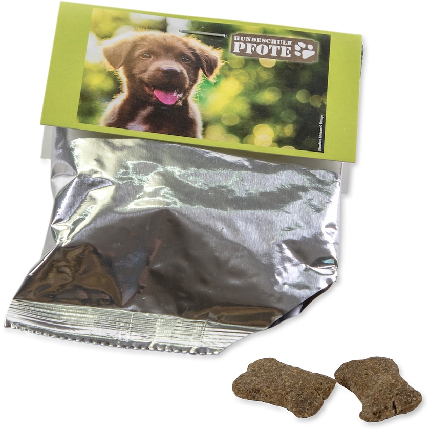 Der Beutel mit dem Hundesnack hat eine Karte, die mit ihrem Logo bedruckt wird. Die Karte wird nach ihren Wünschen bedruckt. Der Hundesnack ist von Happy Dog und eignet sich für Hunde ab 4 Monate.