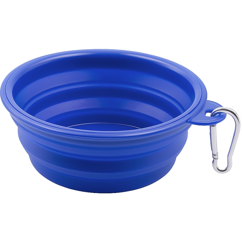 Faltbarer Hundenapf mit Karabinerhaken. Da der Hundenapf zusammengefaltet werden kann, nimmt er wenig Platz weg, wenn er nicht gebraucht wird.