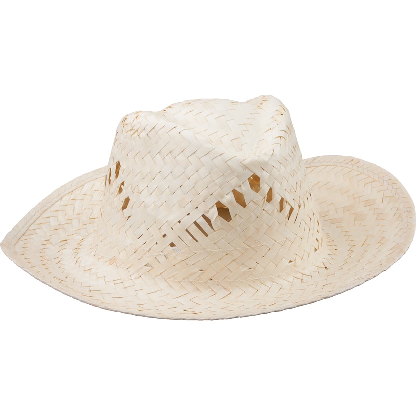 Naturfarbener Strohhut für Männer. Der Druck erfolgt auf einem non-woven-Band in wahlfreien Farben (siehe Detailbild), das auf den Hut genäht wird.