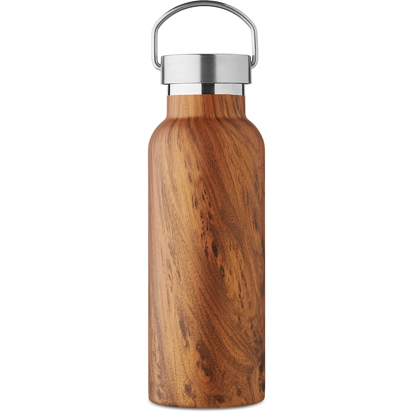 Thermosflasche aus Edelstahl mit Holzoptik. Der Stahl besteht zu 90% aus recyceltem rostfreiem Edelstahl und zu 10% aus rostfreiem Stahl. Die Thermosflasche ist auslaufsicher. Man kann diese entweder bedrucken oder die Beschriftung kann per Lasergravur erfolgen.
