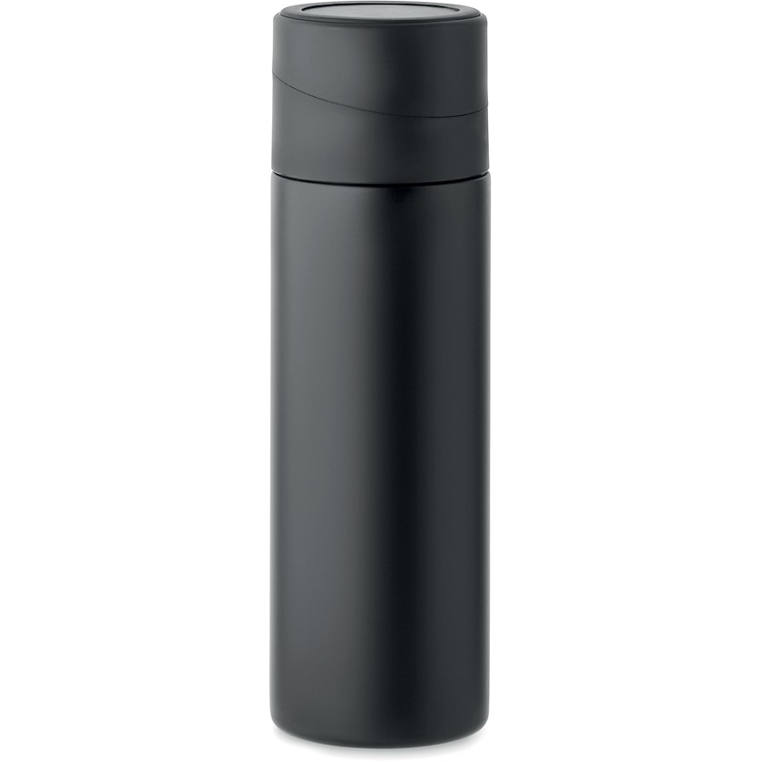 Einzigartige Thermoskanne mit Handyhalter im Deckel. Die Thermoskanne hat doppelt vakuumisolierte Wände und besteht zu 90 % aus recyceltem Edelstahl und zu 10 % aus Edelstahl. Die Hülle verfügt über einen Silikonring, der das Handy an Ort und Stelle hält, wenn es auf die Hülle gelegt wird.