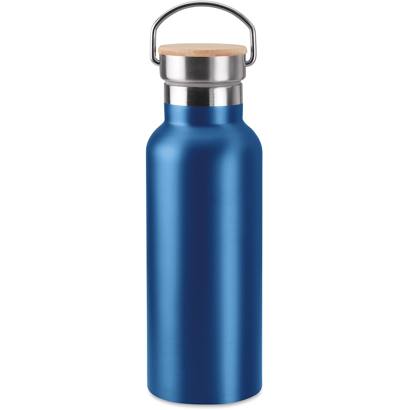 Modern designte Thermosflasche aus Edelstahl. Longmont verfügt über doppelte Wände und kann sowohl dafür verwendet werden, um Getränke warm als auch kalt zu halten. der Verschluss zeigt Details aus echtem Bambus. Die Flasche ist auslaufsicher.