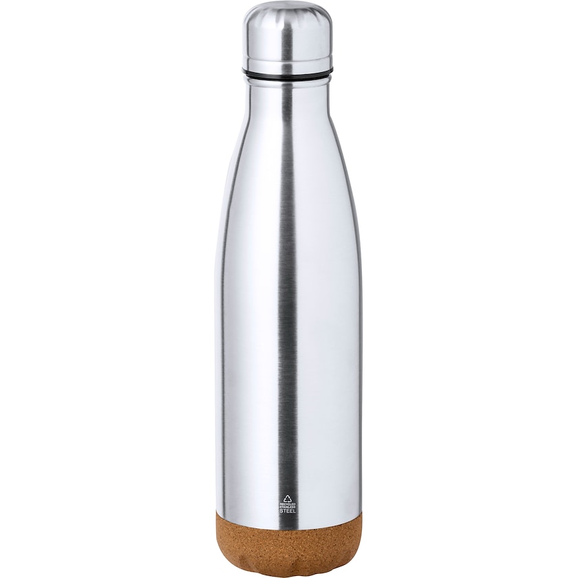 Thermosflasche aus recyceltem Edelstahl mit Korkboden. Der Spencer fasst 50 cl und hat doppelt vakuumisolierte Wände. Ein Symbol auf der Vorderseite zeigt an, dass er aus recyceltem Edelstahl hergestellt ist.