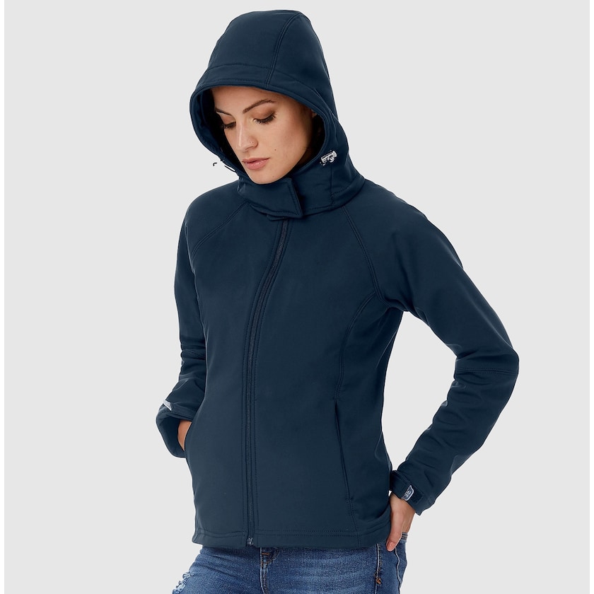 Moderne Softshell-Jacke mit Kapuze. Die Jacke ist aus einem modernen 3-lagigem Stoff mit hochwertiger Membran für maximalen Komfort. Die Membran macht die Jacke wind- und wasserdicht, lässt sie aber atmungsaktiv. Der Stoff ist mit einem wasserabweisenden Material behandelt. Die Kapuze ist abnehmbar. Innen hat die Jacke eine schönes Fleece-Futter. Gibt es auch als Herrenmodell.