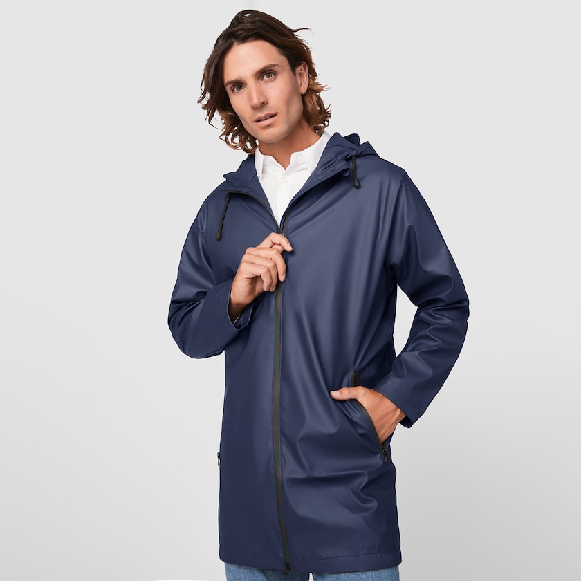 Herren-Regenmantel mit Kapuze. Der Regenmantel ist wasserdicht und hat zwei Seitentaschen mit Reißverschlüssen. Roly fällt klein aus. Wählen Sie daher bitte eine Nummer größer, wenn Sie normalerweise zwischen zwei Größen liegen. Gibt es auch als Damenmodell.