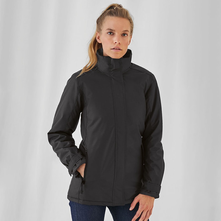 Gefütterter Parker. Die Jacke hat eine versteckte Kapuze im Kragen und vorne zwei Taschen mit Reißverschlüssen. Die Innentasche ist ebenfalls mit Reißverschluss versehen. Die Ärmel sind ergonomisch geformt und erlauben mehr Bewegungsfreiheit. Gibt es auch als Herrenmodell.