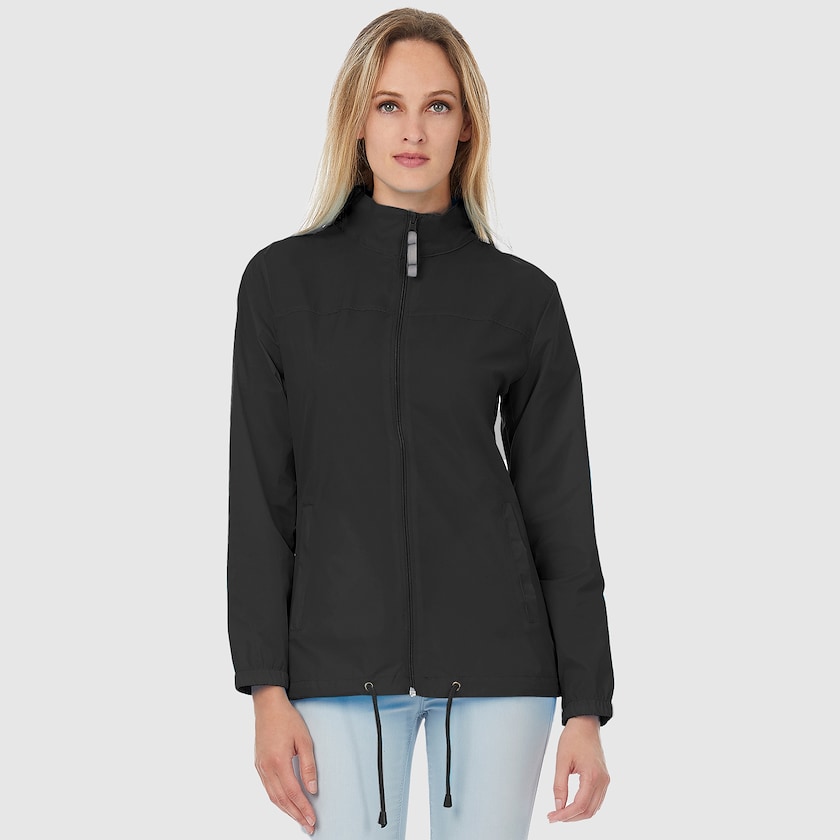 Günstige Damenjacke mit Logo von B&C. Gut geeignet für große Kampagnen! Zeitloses Design, mit Reißverschluss und versteckter Kapuze im Kragen. Justierbare Kapuze und Taille. Die Jacke ist gefüttert. Gibt es auch als Herrenmodell.