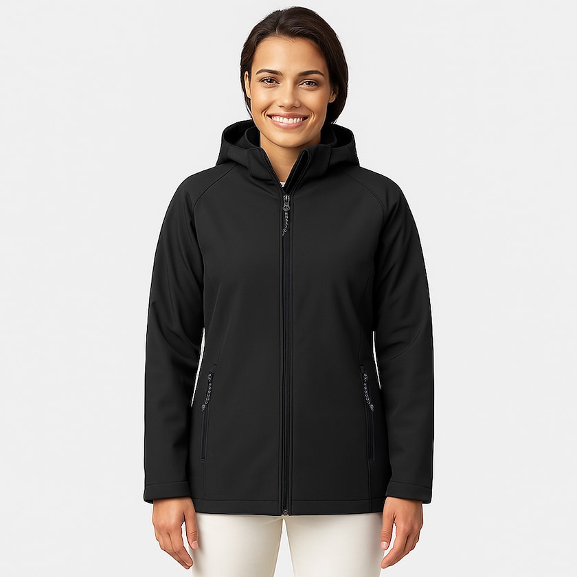 Moderne Softshell-Jacke für Frauen. Die Jacke hat ein modernes Design mit einer abnehmbaren Kapuze und einer taillierten Form. Seitentaschen und Ärmeltasche sind mit einem Reißverschluss versehen. Innen befindet sich eine größere Innentasche. Gibt es auch als Herrenmodell.