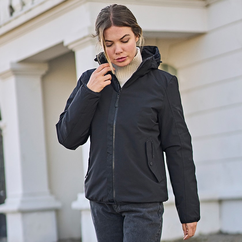 Damenjacke mit wasserabweisenden Eigenschaften. Die Jacke hat eine abnehmbare Kapuze und doppelte Vordertaschen. Die Jacke ist aus einem zuverlässigem Material und hält gut warm. Gibt es auch als Herrenmodell.