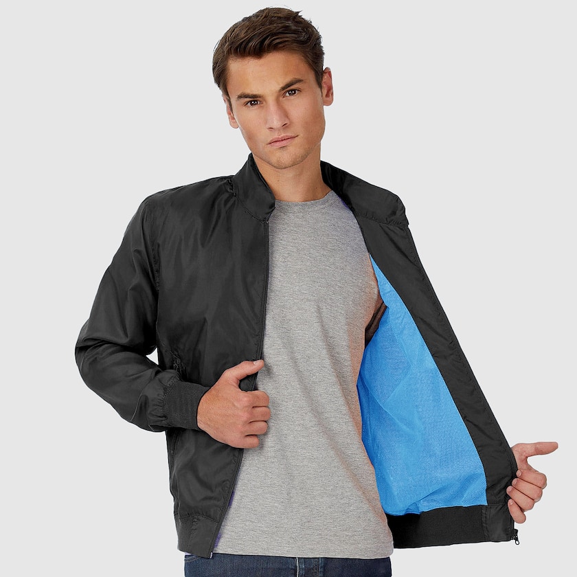 Trendige Bomberjacke für Männer. Die Jacke hat eine versteckte Kapuze im Kragen, vorne zwei Taschen mit Reißverschlüssen und eine Innentasche. Eine schicke, trendige Bomberjacke! Gibt es auch als Damenmodell.