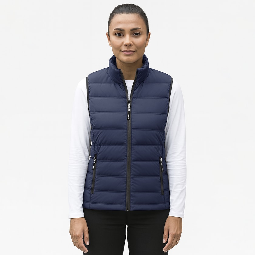 Umweltfreundliche Daunenweste für Damen. Die Taschen sind mit Reißverschlüssen versehen. Der Oberstoff besteht aus 100% Polyester und das Futter enthält 90% recycelte Daunen und 10% recycelte Federn. Gibt es auch als Herrenmodell.