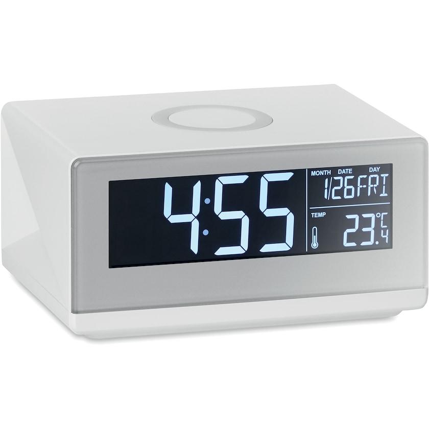 Kabelloses Ladegerät, das auch als Wetterstation und Wecker funktioniert. Das Ladegerät ist mit allen aktuellen Mobiltelefonen kompatibel.