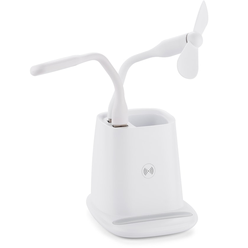Kabelloses Ladegerät kombiniert mit Stifthalter, Lampe und Ventilator. Wenn das Ladegerät für keine der Funktionen verwendet wird, funktionieren die USB-Anschlüsse als Hub. Wird in einer weißen Geschenkverpackung geliefert.