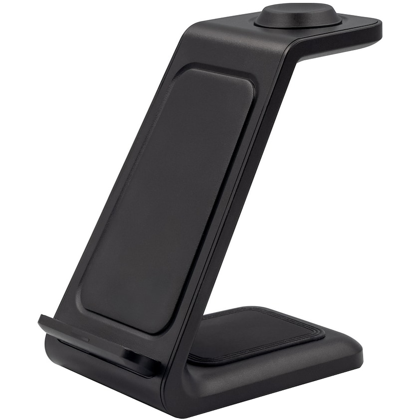 Kabelloses Ladegerät, das auch als mobiler Support dient. Kann drei Geräte gleichzeitig laden. USB-Typ-C-Kabel im Lieferumfang enthalten.