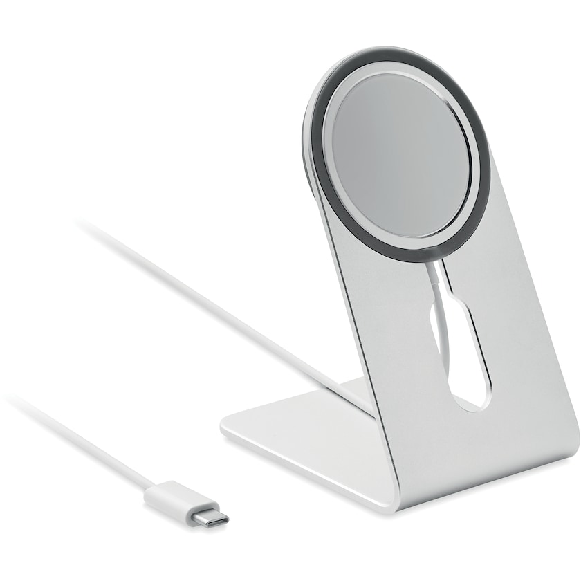 Magnetisches kabelloses Ladegerät aus Aluminium. Kompatibel mit den neuesten Android-Modellen sowie iPhone 12 und neuer. Ein zusätzlicher Magnetring ist im Lieferumfang enthalten, um das Aufladen von nichtmagnetischen Mobiltelefonen zu ermöglichen. Die Beschriftung kann wahlweise mit Druck- oder Lasergravur erfolgen.