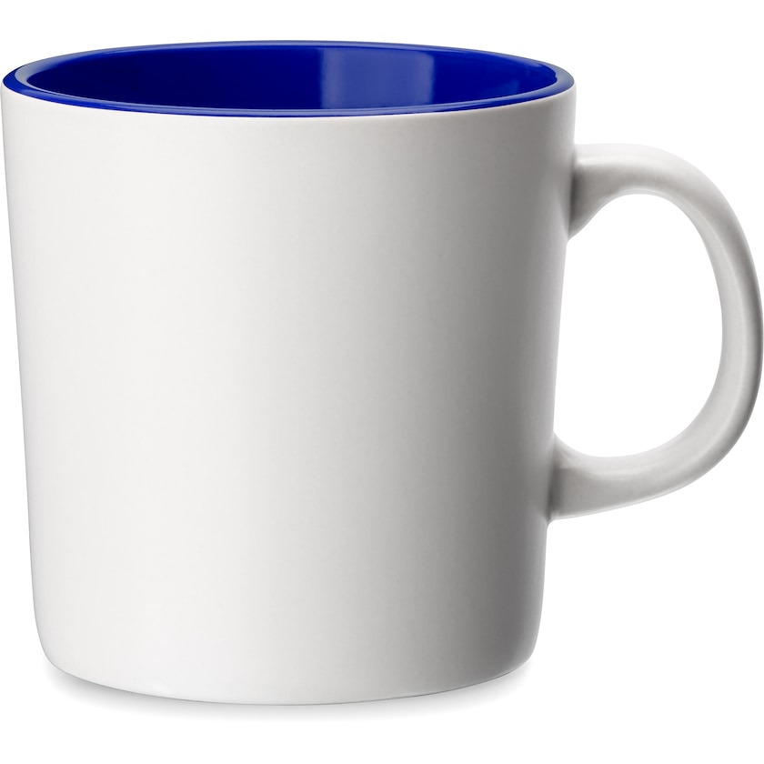 Kaffeebecher mit weißer Außenseite und glänzender, farbiger Innenseite. Der Druck kann innen, außen, unten oder am Henkel sein. Ein wunderschöner Becher aus robustem Steingut.