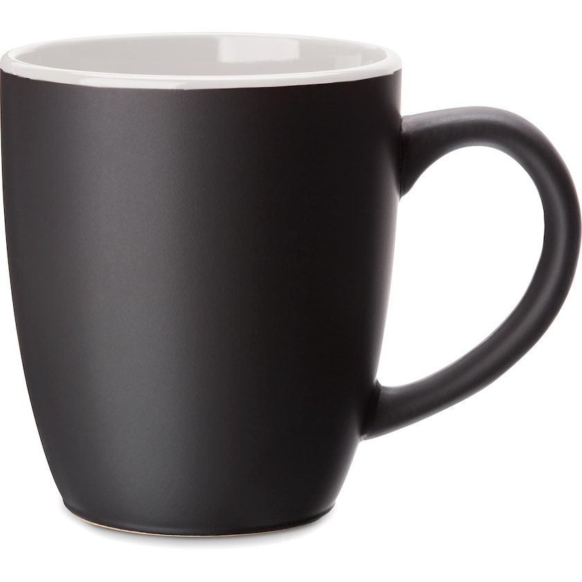 Eleganter Steingutbecher mit großem Henkel. Die Außenseite ist matt und die Innenseite glänzend. Beim 1-farbigen Druck beträgt die Druckfläche ganze 130 x 30 mm.