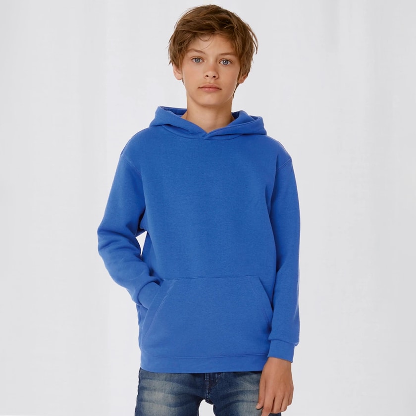 Kapuzenpulli für Kinder ab 10 Stück bestellbar. Der Pullover hat eine normale Passform und ist aus einer zuverlässigen Baumwoll-Polyester-Mischung. Aus Sicherheitsgründen hat die Kapuze keine Schnur. Geliefert wird einzeln verpackt in Plastikhüllen. Gibt es auch als Modell für Erwachsene.