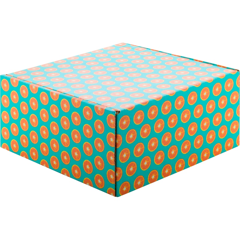 Großer quadratischer Karton aus Wellpappe. Der Karton wird mit einem selbstklebenden Streifen versehen, der das Verschließen erleichtert. Die gesamte Außenseite wird nach Ihren Vorgaben bedruckt, und alle Boxen werden unmontiert und flach geliefert.