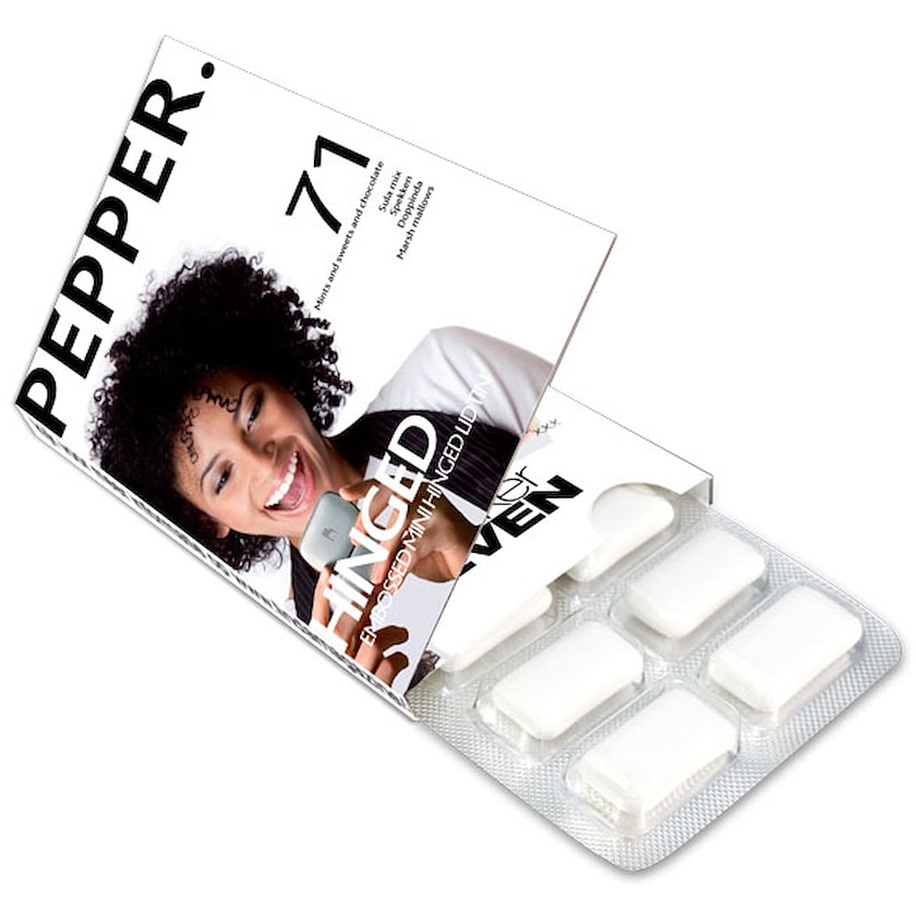 12 zuckerfreie Mintkaugummis mit Xylit. Die Verpackung hat eine zusätzliche Umschlagseite, perfekt für Ihren Werbedruck.