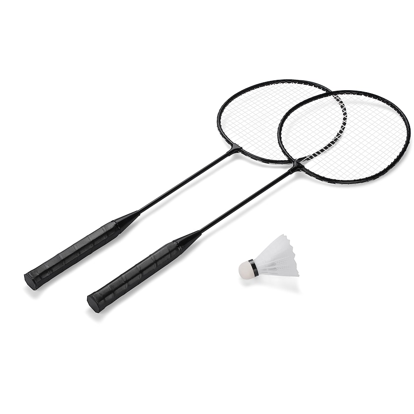 Set bestehend aus zwei Badmintonschlägern und einem Federball. Geliefert in einer Verwahrungstasche mit Trageriemen. Gedruckt wird auf die Verwahrungstasche.