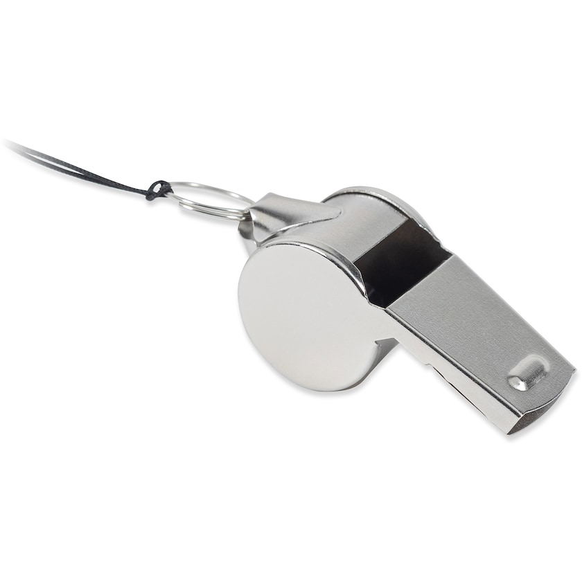 Metallpfeife. Die Pfeife wird mit einer Schnur geliefert. Die Markierung erfolgt durch Aufdruck- oder Lasergravur.