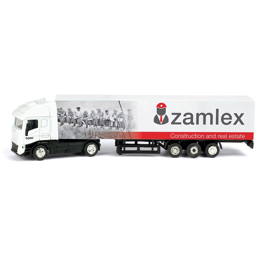 Der Lastwagen kann mir 4-Farb-Fotodruck bedruck werden. Der Druck erfolgt auf dem Auflieger. Die Räder drehen sich. Der Lastwagen hat eine Größenverhältnis von 1:87. Geliefert wird in einer transparenten Kunststoffverpackung. Ein cooles Werbeprodukt für Unternehmen in der Transportbranche.